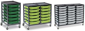 Low Charcoal Metal Frame Plastic Tray Mobile Storage available in 3 widths - single column with 6 trays, double column with 12 trays and triple column with 18 trays and also a slightly higher tray storage with 3 columns and 24 trays. The units come with heavy duty castors two with locking facility. These units are supplied with Monarch Trays in a variety of colours. The recessed tops are removable with open corners for easy cleaning. These units are suited to school, classroom, and other educational environments, and may also be used at home, in the office, or in workshop settings. Manufacturer 5 year guarantee.