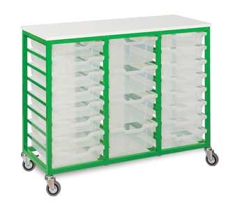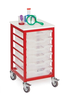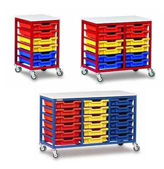 Fully assembled metal-frame tray storage units taking 6, 12 or 18 Monarch Single plastic trays. These units are suited to school, classroom, and other educational environments, and may also be used at home, in the office, or in workshop settings. The unit comes in a choice of red, blue, yellow, apple green, cyan, tangerine, lime, white or light grey & dark grey frames, and with rubber wheels two of which are lockable and a light grey wooden top. The full range of tray colours are available with this unit. Or order a combination of tray colours (see below).