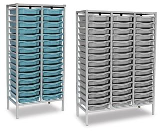 Mid Height Grey Metal Frame Plastic Storage available in 2 widths - double column with 30 trays and triple column with 45 trays. The units are static with a 25 x 25mm ERW steel frame, fully welded with an epoxy powder coated finish and frames are fitted with heavy duty feet. These units are supplied with Monarch Trays in a variety of colours. The recessed tops are removable with open corners for easy cleaning. These units are suited to school, classroom, and other educational environments, and may also be used at home, in the office, or in workshop settings. Manufacturer 5 year guarantee.