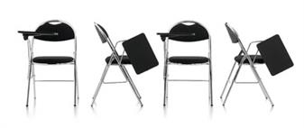 The Milan Folding Writing Tablet Chair features a sturdy soft black vinyl upholstery with chrome frame and a right hand foldaway poly writing tablet. The chrome frame comes with floor protecting feet (anti-scratch rubber feet). The right hand foldaway poly tablet has a wipe clean polymer surface that is easily fitted to the chair and features swivel action to ensure the table slides away for easy access. The chair has a cushioned seat and back rest and is wipe clean. Recommended usage 8 hours and maximum weight capacity is 115 kgs. The chairs can be used in conference halls, meeting and training rooms and public waiting areas. Minimum order 4 chairs.