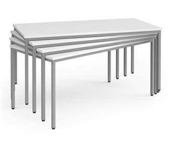 Multi-Purpose Tables - Silver Frame, for canteen or breakout areas, suitable as a meeting table, or for a wide variety of uses in a number of different environments. The tables come in square or rectangular shapes and in a variety of sizes. It features a silver frame, and legs with adjustable feet, and a rectangular table top 25mm thick, in a choice of 4 finishes: Beech, Oak, Grey Oak and White. The rectangular tables can be spiral stacked. The tables require simple assembly and comes with a 1 year guarantee.
