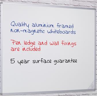 Non-Magnetic Writing Boards are double sided - plain one side with grid on the reverse. The grid on the reverse of the board are 25mm squares. Boards come in 6 sizes, each with a satin silver anodised aluminium frame and rounded safety corners and concealed corner fixings. Pen ledge and wall fixings are included and these boards are suitable for protrait or landscape use and come with a 5 year surface guarantee.