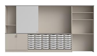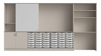 Open Teacher Storage Wall comes in just over 4 metres wide and incorporates state of the art sliding interactive whiteboard and cupboard doors along with a centre media area, 42 storage trays in a variety of colour choices and open area which features an integrated desk . Designed for teachers and their classrooms, these storage walls create an ordered room with efficient space for storage. The centre of the wall is the area to house a media area - (media unit not included). The storage wall contains numerous storage cupboards & shelving in 18mm MFC thickness and come as standard with key locks. It also features one sliding whiteboard. Available in 8 finishes. Full installation service from the manufacturer is included (approximate installation time 1 day). 5 year component guarantee.