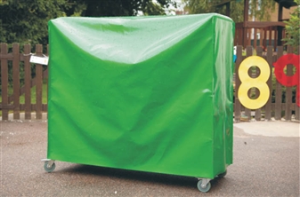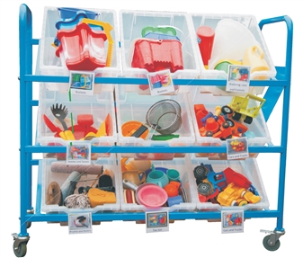 Outdoor Lunchbox Trolley is a must for the outdoor classroom with a durable powder coated steel frame and mounted on strong castors, the trays are angled to give easy access for younger pupils. Ideal for the school playground or early years environments. Each unit comes with a high quality rainproof cover that means the units can be left outside all year roudn if required. The trolley is fully welded units on lockable castors, making the trolleys easy to wheel from room to playground. The unit comes with a blue frame and clear plastic storage trays.The units come ready assembled and with a 5 year manufacturer guarantee.