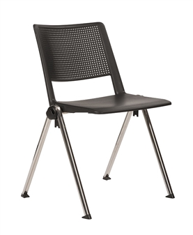 The Pinnacle Black Stacking Chair, features a sturdy black plastic seat with perforated plastic back, mounted on a robust metal frame, which comes in black or chrome. The chair is ideal for school classrooms, meeting rooms, conference halls, or waiting areas, and is stackable up to 8 high. Optional arms are available which feature arm rests which will flip up to allow the chairs to stack. An optional trolley will carry up to recommended 10 stacked chairs. There is a minimum order quantity of 4 chairs, and the manufacturer offers a 5 year guarantee on the chair.