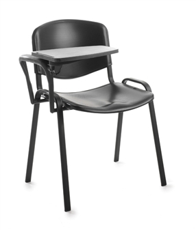Plastic Chair With Writing Tablet, with plastic seat and back, and black 4 leg metal frame, and available for 1-2 day delivery. An ideal exam chair or student study chair with right-handed writing tablet. The plastic chair comes in a choice of blue or black. Minimum order 4 chairs. 1 year manufacturer guarantee.