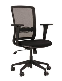 Plexus Mesh Back Operator Chair, with firm padded seat upholstered in black fabric, and robust square design mesh back with built in lumbar support. The chair features a seat-tilt mechanism with weight tension control, and 3D adjustable arms (height, pivoting pad and forward/backward adjustments). With a black nylon spider base, this chair is both functional and modern, and great value. Ideal for students and teachers.