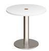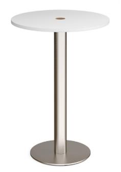 Power Ready Poseur Table with brushed steel flat round base and a white laminate 800mm round top. The table comes with an 80mm round cutout routed in the table top in a central position and accomodates the Ion Power Module which is an optional extra. The Power Modules can then be dropped into position, with cables hard-wired into them which feed down through the hollow table coloumn and under the base floor. These tables are suitable for cafe or leisure settings, eating areas, breakout areas, reception areas etc.. Ideal furniture for schools, restaurants, cafes, bistro areas, public sector organisations etc..