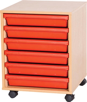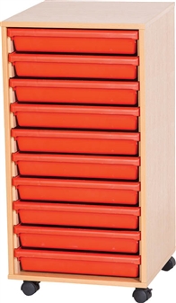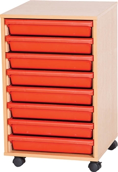 Premium A3 Art Tray Units available with 6, 8 or 10 trays, with Gratnells plastic art trays in a mobile wooden carcase. The plastic art trays come in red, blue, yellow or green, and are ideal for storage of art and craft paper and materials. These storage units are ideal furniture suited to the school, classroom, and other educational environments, and may also be used at home, in the office or workshop. The units come fully assembled and come in a durable, wipe-clean, scratch resistant laminate finish in a choice of 5 wood finishes - beech, maple, oak, grey & white They come with a 5 year guarantee.