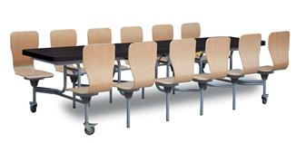 Premium Mobile Folding Table With 12 Full Seats - comes with a grey frame and is easy to fold, store and clean, and comes with an open position safety lock to ensure tables do not revert to the folding position. The unit comes with heavy duty locking castors. There are 3 contempary gloss or or oak effect top options (water resistant & easy clean) and with oak seats. Designed to be used in secondary or higher education. Fits through a standard height doorway (1980mm) for storage & transportation and has transport and storage locking positions. FIRA certified and a comes with a 16 year warranty on welds and mechanism.