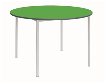 Fully-welded, circular classroom tables in seven sizes, which come with a hardwearing 18mm MDF laminated top, and in a range of laminate colours. Available in 6 heights to suit ages 3 through to adult (see below). This table/desk will suit any school classroom, or other educational and learning environment. The tables come in a choice of sizes with a spray Duraform PU edge. Each table has a sturdy steel frame which comes in a choice of 4 different frame colours. (For associated tables with matching frame and edge type, see Related Products.)