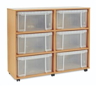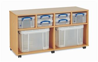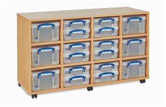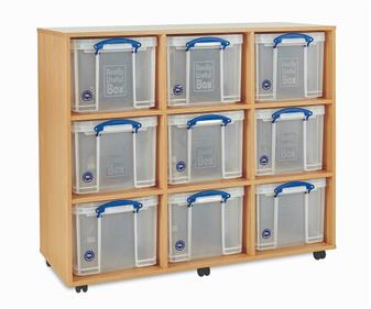 Really Useful Box Storage Range fully assembled mobile storage units in a beech finish. These mobile units are suited to school, classroom, and other educational environments, and may also be used at home or in the office. These units are available in a variety of sizes and a range of box sizes with lids.