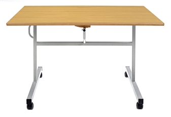 Rectangular Tilt Top Dining Table, perfect for regular or occasional use in the classroom or school dining area. The table is easy to open and close and then when tilted up can be wheeled away for convenient storage. It comes with a hardwearing 18mm MDF laminated top in a range of laminate colours, and Duraform PU edge with rounded corners and in 5 different colours to either match or contrast. Available in 6 heights to suit a variety of ages. The table comes supplied with a choice of 4 frame colours, 2 sizes and with a 5 year guarantee.
