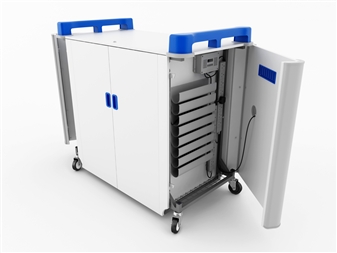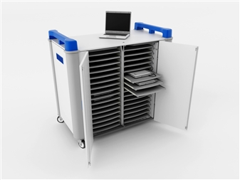 Housing 32 laptops, this unit stores each laptop in it's own individual horizontal sliding tray. Soft rubber grips cushion and protect laptops when in storage and large L-shaped doors and sliding shelves provide easy, clear access to laptop storage compartments. A separate compartment with rear facing doors allows easy access to the individual AC adapters supplied with the laptop and utilises an innovative cable storage system that keeps cables compact, neat and tidy.
