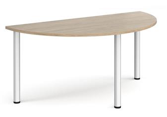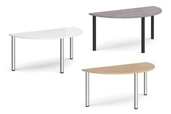 Semi Circle Radial Leg Tables, for breakout or canteen areas, and also suitable as a meeting table, or for use in a number of different environments. The table comes on a 1-2 day delivery. It features 4 stylish legs in black, chrome, silver & white, and rectangular table top in a choice of 7 finishes: Beech, Oak, Barcelona Walnut, Onyx Grey, Kendal Oak, Grey Oak or White. The tables come in 1 size, order two to make a large circular meeting table or and can be used with a 1600mm rectangular table to create a rounded meeting end table (See Related Items). The table requires simple assembly and comes with a 1 year guarantee.