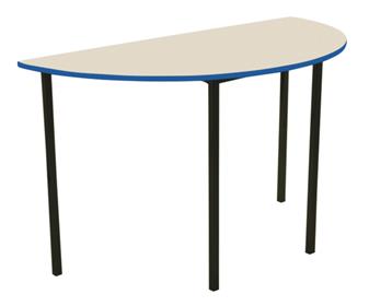 Semicircular School Tables - PU Edge, in two sizes: 1100w x 550d (standard primary size) and 1200w x 600d (standard secondary size). The table comes with robust 25mm fully welded square section frame, and with laminated top in a range of colours and an extremely hardwearing spray PU edge which comes in a choice of 3 colours. The tables can be pushed together with other semicircular tables, or with rectangular tables in the same range (see Related Items), or can stand alone. Available in 6 heights, these tables are used throughout school classrooms in the UK. The steel frame is available in a choice of several different Epoxy powder coated frame colours. UK manufactured and come with a 5 year guarantee. (For associated tables in the same range with matching frame and edge type, see Related Products).