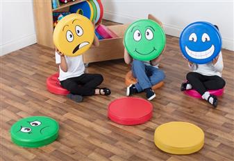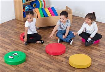 Set Of 12 Emotions Cushions (Single Sided) - With Trolley - a multi-functional classroom essential comes with 12 brightly coloured floor cushions. Each cushion comes with different facial expressions to facilitate group discussion around managing feelings and emotions. Supports PSE development in accordance with the Early Years Foundation Stage. Suitable for nursery school, pre-school, play school, and early years. The trolley is hand made from solid wood, and the cushions are made with brightly coloured, soft touch, wipe clean vinyl and manufacured to exacting quality standards with the foam and vinyl meeting all relevant safety and fire standards.