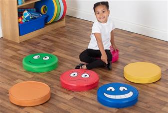 Set Of 6 Emotions Cushions (Single Sided) - Pack 2, with different facial expressions to facilitate group discussion around managing feelings and emotions. Supports PSE development in accordance with the Early Years Foundation Stage. Suitable for nursery school, pre-school, play school, and early years. Children can have fun learning personal, social, and health education. Also useable as wipe clean story cushions. Made with brightly coloured, soft touch, wipe clean vinyls. The cushions are made to exacting quality standards and the foam and vinyls meet all the relevant safety and fire standards.
