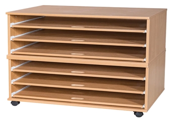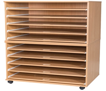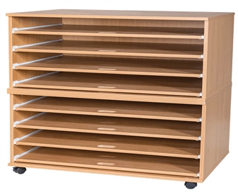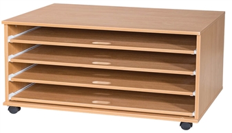 Sliding A1 Paper Rack, fully mobile, ideal for the art room, workshop, and other storage areas. This wooden storage unit is ideal for the school classroom, artroom, office, or other storage areas in the school. Built to house artwork, large plans, and other work up to A1 size, with 5 pull-out shelves. An attractive filing storage unit that will fit well in the school environment. The unit comes fully assembed and is manufactured in a scratch resistant, wipe clean laminate in a choice of 5 wood finishes - beech, maple, oak, grey or white.