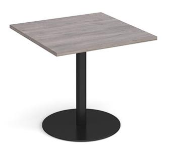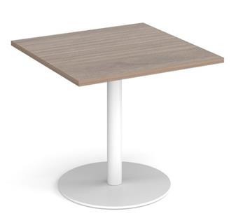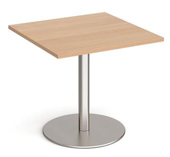 Square Circular Base Cafe/Bistro Tables with heavy steel base made from a single column with flat round base. The base is available in brushed steel, white, or black, and the 800mm square top which comes in a variety of top colours. The table sits easily with our range of fabric & vinyl seating, and is ideal in staff rooms, reception areas, waiting rooms etc..