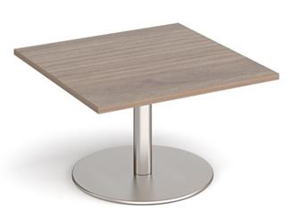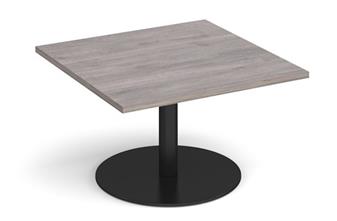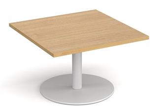 Square Circular Base Coffee Tables with heavy steel base made from a single column with flat round base. The base is available in brushed steel, white, or black, and the 800mm square top which comes in a variety of top colours. The table sits easily with our range of fabric & vinyl seating, and is ideal in staff rooms, reception areas, waiting rooms etc..