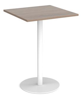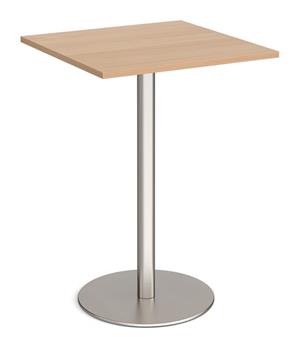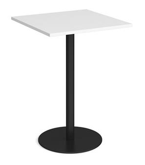 Square Circular Base Tall Tables with heavy steel base made from a single column with flat round base. The base is available in brushed steel, white, or black, and the 800mm square top which comes in a variety of top colours. The table sits easily with our range of fabric & vinyl seating, and is ideal in staff rooms, reception areas, waiting rooms etc..