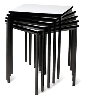 Square Spiral Stacking Table - PVC Edge, with robust 25mm fully welded square section frame, and with laminated top in a range of colours and a PVC edge which can be chosen to match the laminate top, or create a contrasting colour to the chosen top colour. Available in 3 sizes and 6 heights, these tables are used throughout school classrooms in the UK, for all age groups. The steel frame is available in a choice of several different Epoxy powder coated frame colours. Tables stack to a recommended 6 high. UK manufactured and come with a 5 year guarantee. (For associated tables in the same range with matching frame and edge type, see Related Products).