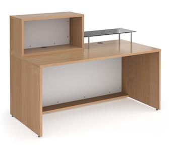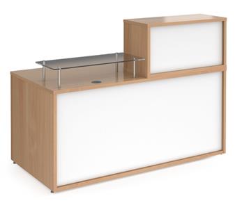 Straight Reception Desk for school or office reception areas, with an 800mm wide top hutch unit and glass shelf. The desk comes in beech with white panels, with surfaces that are scratch and heat resistant, and the desktop comes with cable access ports. The top hutch unit and glass shelf can be fitted on either the right or left hand side. The reception unit is supplied flat-packed for easy self-assembly.
