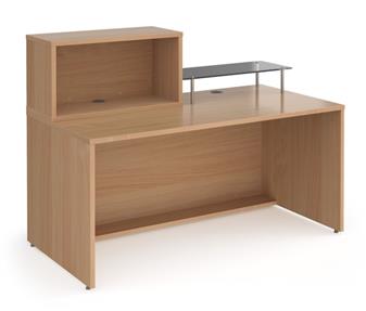 Straight Reception Desk for school or office reception areas, with an 800mm wide top hutch unit and glass shelf. The desk comes in beech with surfaces that are scratch and heat resistant, and the desktop comes with cable access ports. The top hutch unit and glass shelf can be fitted on either the right or left hand side. The reception unit is supplied flat-packed for easy self-assembly.