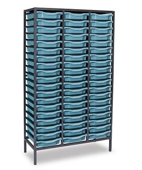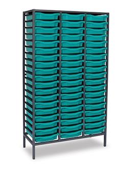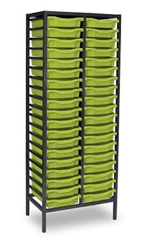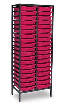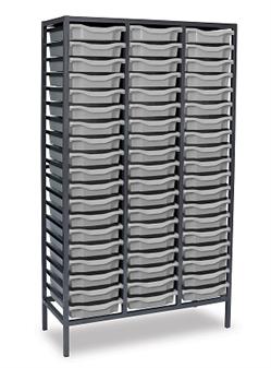 Tall Charcoal Metal Frame Plastic Storage and available in 2 widths - double column with 38 trays and triple column with 57 trays. The units are static with a 25 x 25mm ERW steel frame, fully welded with an epoxy powder coated finish and frames are fitted with heavy duty feet. These units are supplied with Monarch Trays in a variety of colours. The recessed tops are removable with open corners for easy cleaning. These units are suited to school, classroom, and other educational environments, and may also be used at home, in the office, or in workshop settings. Manufacturer 5 year guarantee.