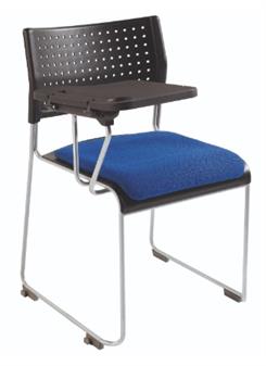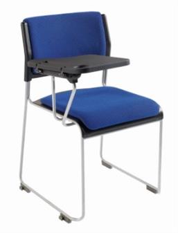 Twilight Stacking Chair With Writing Tablet - Upholstered - Vinyl. The chair comes with a solid steel skid frame in silver and either upholstered seat only, or upholstered seat and back, with right-hand writing tablet which folds down when not in use.