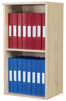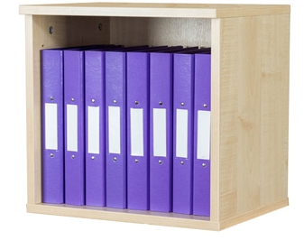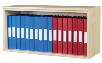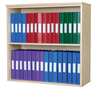 Fully assembled wall mounted open storage units with 384mm between shelves to accomodate foolscap files, lever arch files, or larger boxfiles size. The storage units can hold 5, 10 or 20 box files. Suitable for the school classroom, staffroom, office, or storage room. The cupboards come in a durable, wipe-clean, laminate finish in a choice of 5 wood finishes