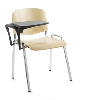 Wood/Chrome Chair With Writing Tablet, with robust wooden seat and back, and chrome frame, and available for 1-2 day delivery. An ideal exam chair or student study chair with right-handed writing tablet. Minimum order 4 chairs. The chair comes with a 1 year manufacturer's guarantee.