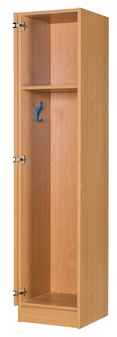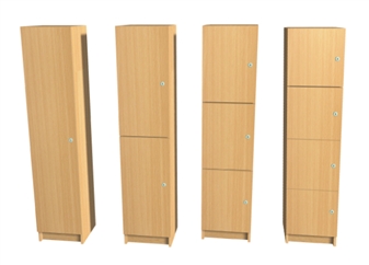 Wooden Lockers - 1800mm High, ideal for school storage, classrooms, education, as staff lockers, for cloakrooms, and a variety of other working environments. The lockers come as 1, 2, 3 or 4-door units, all at 400mm deep. The single door locker includes a shelf and 2 coat pegs. The lockers are robust and durable and each has a solid 15mm beech laminate back. They can be nested together to create banks of lockers. The carcase of the lockers come in solid laminate, and there is a choice of 4 wood finishes. There are handle options - finger-hole or knob, or a lock and key option. The lockers come with a 5 year guarantee.