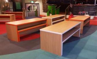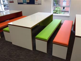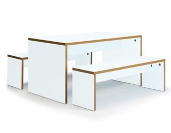 Woodland Tables & Benches, with thick 40mm panels for the table tops and legs. The tables come in a hard laminate finish, available in a wide choice of colours, and finished with a tough PVC edge, also available in a range of colour options. The tables are robust and hardwearing, wipeable and extremely easy to clean and maintain. There are 4 different sized tables - 1200, 1500, 1800 and 2200mm wide, and corresponding sized benches. Benches can store underneath the table if required. The tables and benches are supplied in sets (comprising 1 x table and 2 x benches). Ideal for school dining environments and public areas such as canteens.