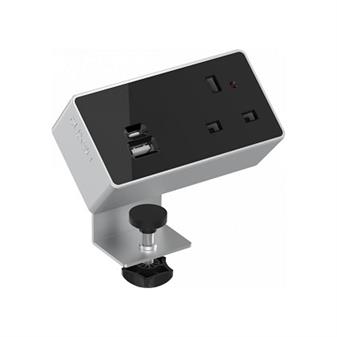 Power Module 1 x UK socket 1 x USB Black Silver (Clamps to Desktop)